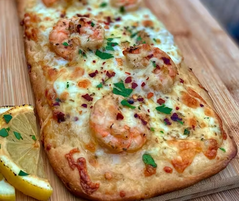 Shrimp alfredo pizza is the kind of dish that feels special but comes together with minimal fuss. Tender grilled shrimp are scattered over warm naan, which makes a quick and delicious base. A generous layer of creamy alfredo sauce ties it all together.