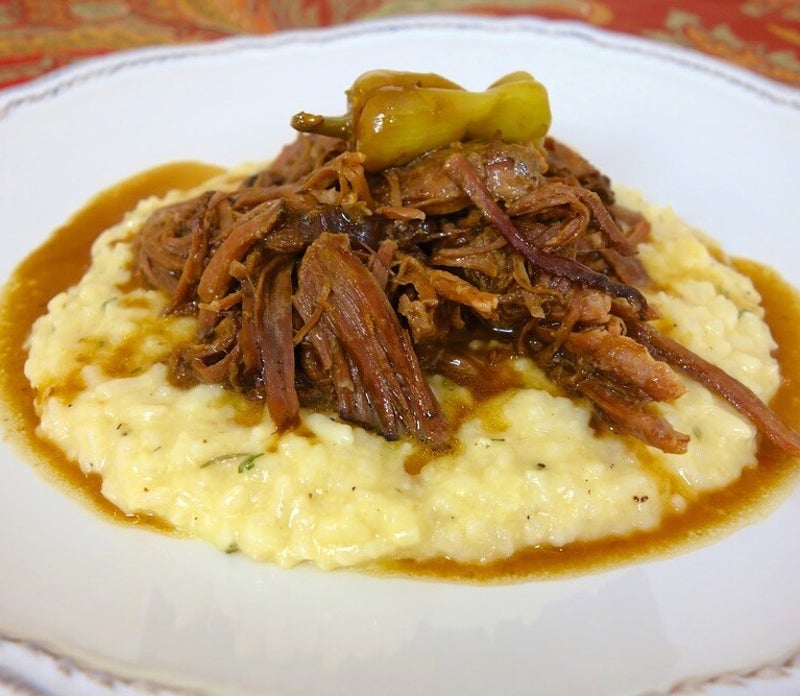 - Add roast back to the pan with gravy and slice. Serve over long grain white rice, jasmine rice, or Cajun Mashed Potatoes. That recipe is coming soon!