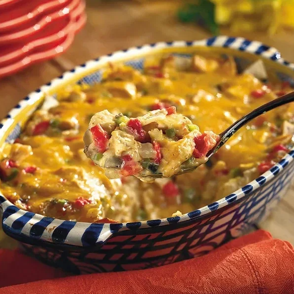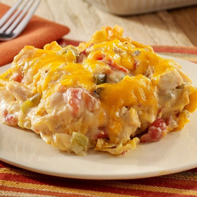 - In a 13 x 9 x 2 baking pan, alternate layers of tortillas, soup mixture, and cheese (3 layers each). Here you can substitute the tortillas for Doritos for a little more flavor!
